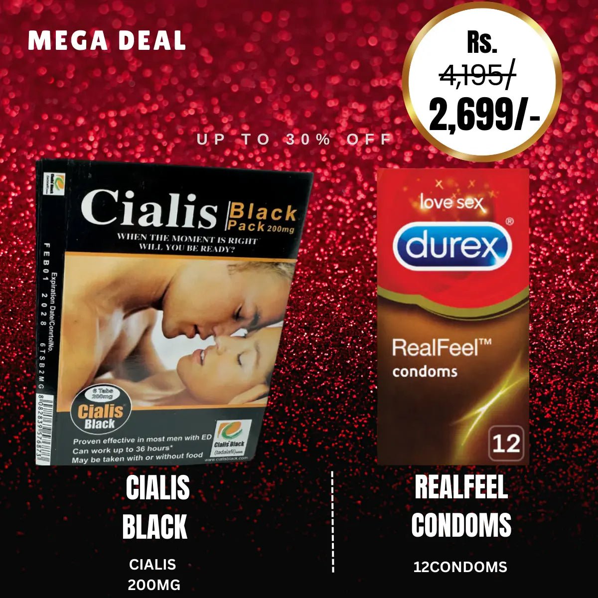 Cialis Black UK(200 Mg) Pack Of 6 + Durex Real Feel Condom - Pack Of 12