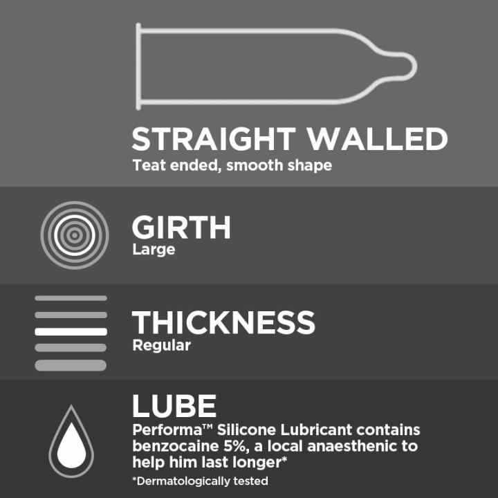 - Special lubricant to help last longer. Containing benzocaine 5%