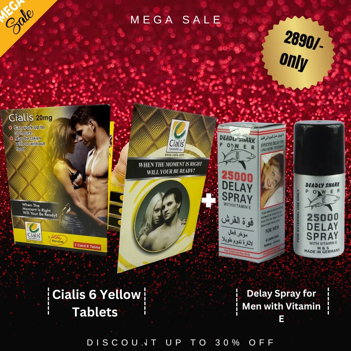 Pack Of 2 Cialis 6 Yellow Tablets Pack For Men 20mg + Deadly Shark 25000 Delay Spray for Men with Vitamin E