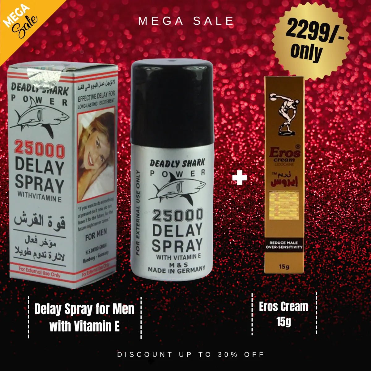 Pack Of 2 Deadly Shark 25000 Delay Spray for Men with Vitamin E + Eros Cream 15g